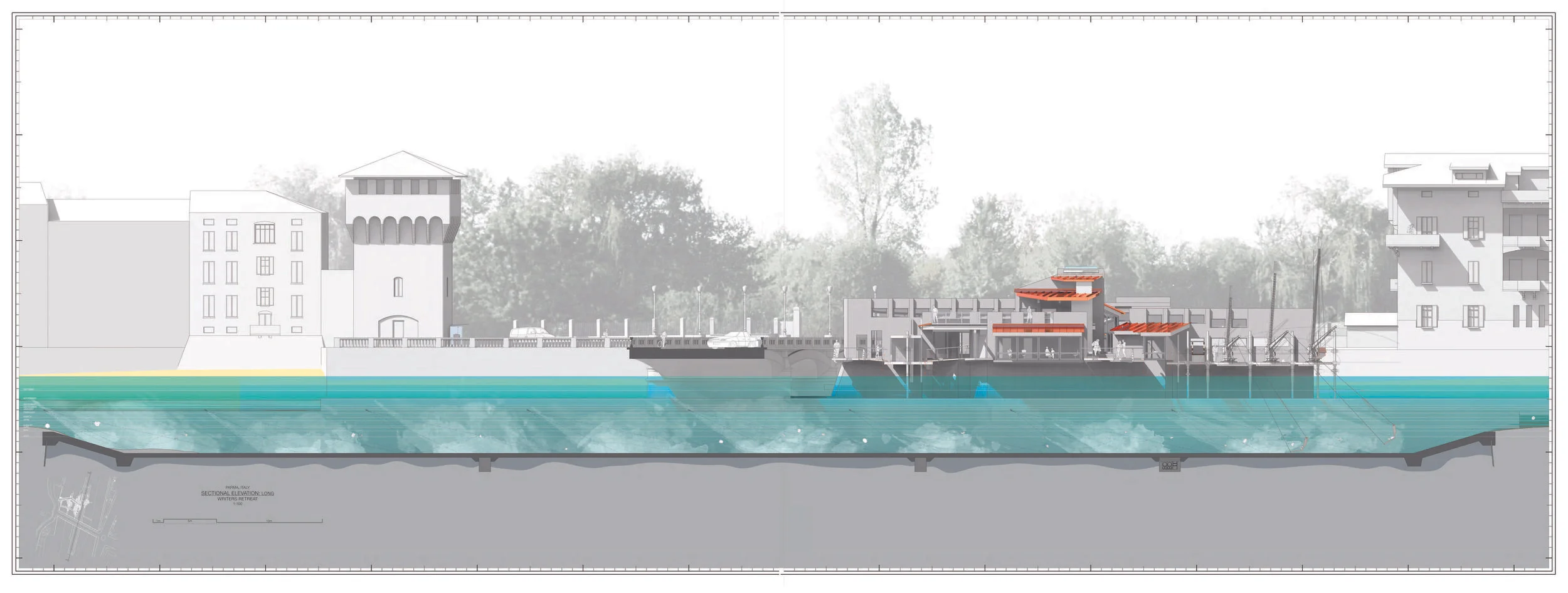 Reacting to the changing levels of Torrente Parma, the building evolves with areas changing levels, becoming isolated, and opening up new spaces.